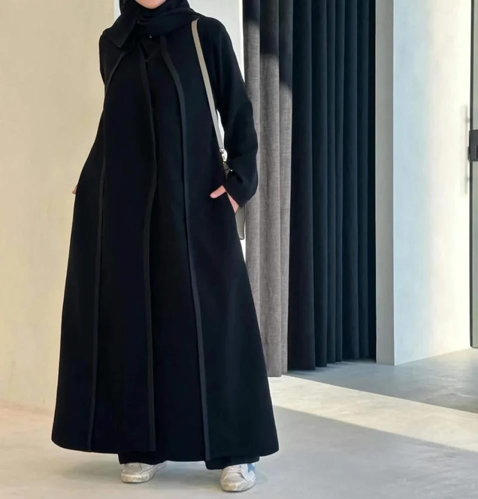 يبرز جمال العباية من خلال الستان الطولي الأسود الذي يضفي طابعًا عصريًا راقٍ على الإطلالة، مع تقفيلة طقطق مريحة وعملية. كما أنها مزوّدة بـ جيوب جانبية مخفية لتمنحكِ حرية وأناقة في آنٍ واحد. مثالية للدوام، الطلعات، والمشاوير اليومية