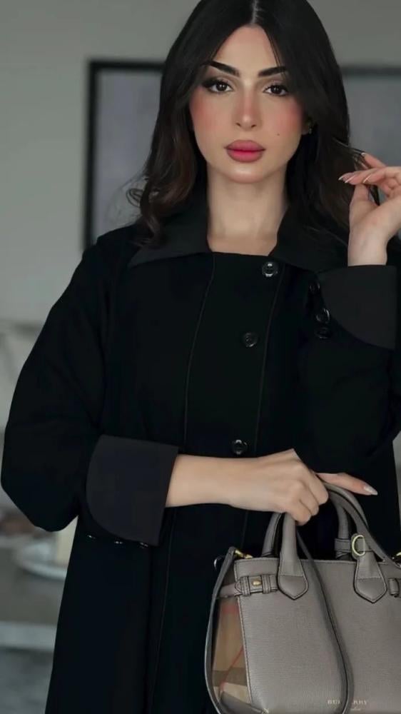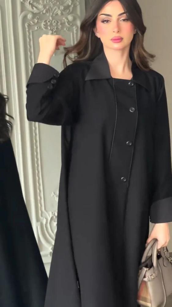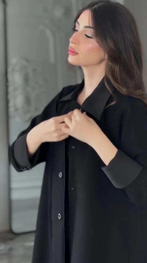 تتميز العباية بياقة كلاسيكية أنيقة وتفاصيل أكمام مقلوبة تعكس مظهرًا رسميًا عصريًا، مع أزرار لامعة على طول العباية تضيف لمسة فخمة وعملية في نفس الوقت. مثالية للدوام أو الطلعات الراقية، وتندمج بسهولة مع أي إكسسوار تختارينه. 🖤