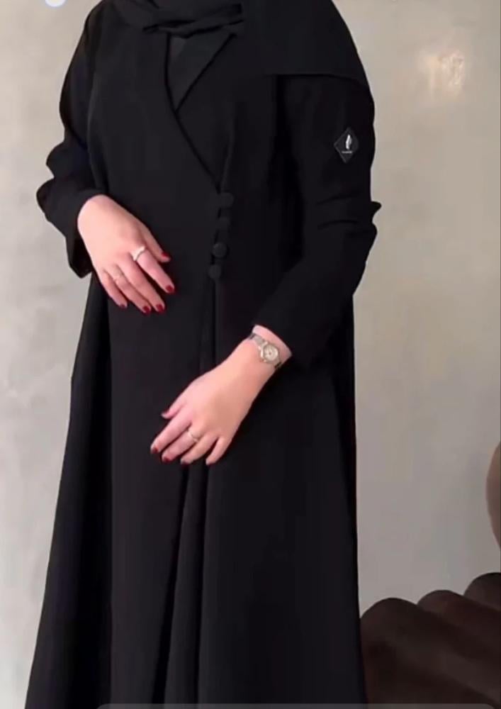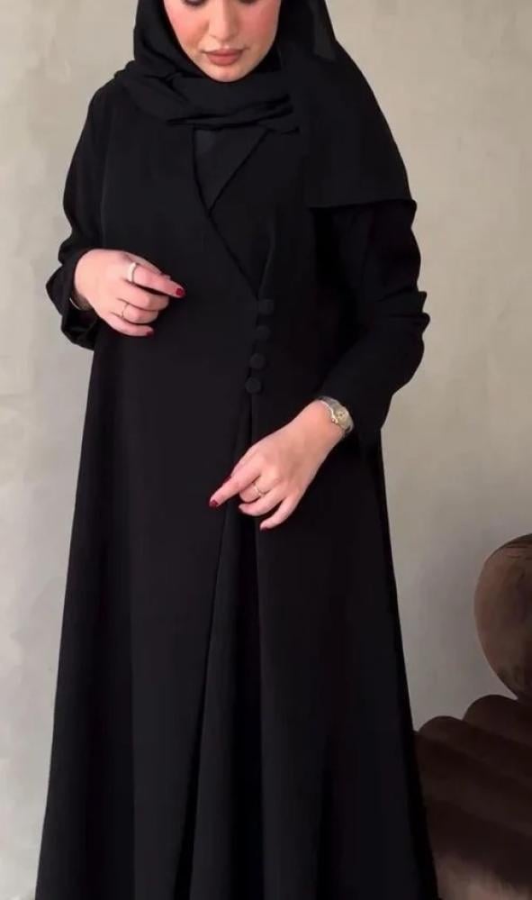 تتميز بتصميم مائل جذاب يُبرز جمال القصة، مع صفّ أزرار أمامي أنيق يضفي لمسة كلاسيكية مميّزة. ومن التفاصيل الذكية وجود ياقة خفيفة بطبقة إضافية تعطي طابعًا رسميًا أنثويًا، بينما تضمن القصة الواسعة انسدالاً ناعمًا وحركة انسيابية في كل خطوة.